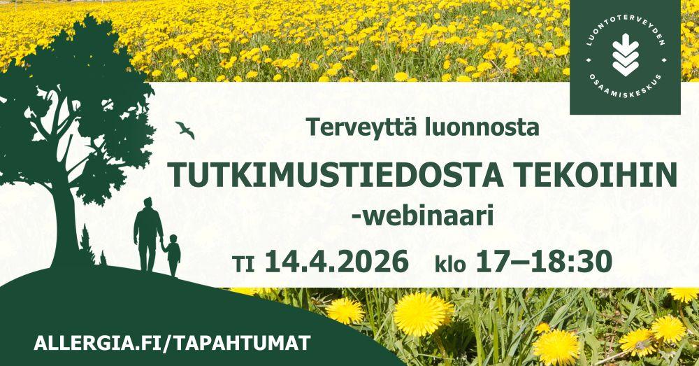 Luontoterveyden osaamiskeskuksen järjestää kaikille avoimen webinaarin: Terveyttä luonnosta – Tutkimustiedosta tekoihin tiistaina 14.4.2026 klo 17–18.30.
